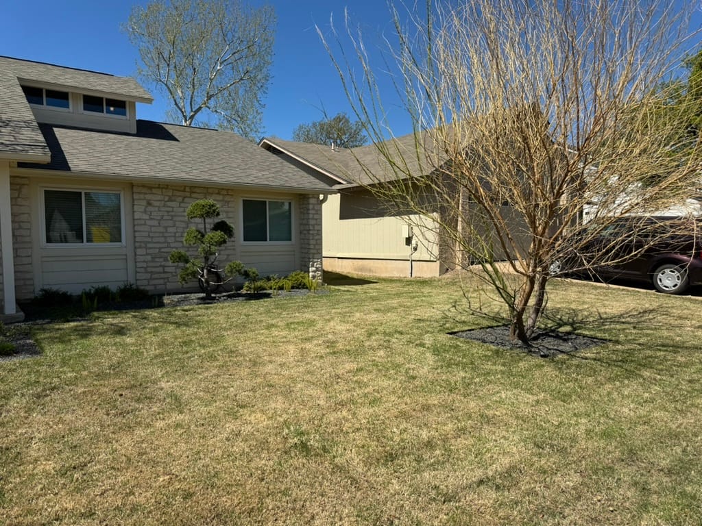 This yard in Balcones just got its second mow of the season yesterday. Still a little tan from dormancy -- that's totally normal for late March in our area -- but look at the structure. Clean edge around the beds. Consistent height across the whole lawn. Fresh cut on that tree ring. This is what a yard looks like when MTEB starts early and stays on schedule.